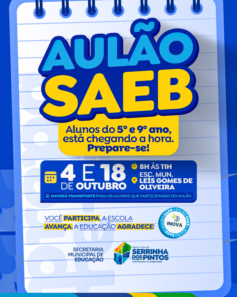 A Prefeitura de Serrinha dos Pintos, por meio da Secretaria Municipal de Educação, promoverá dois encontros de preparação para o Sistema de Avaliação da Educação Básica (SAEB) 2025.
