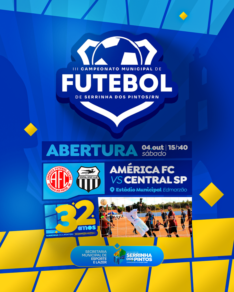 Neste sábado, 04 de outubro, a partir das 15h40, o Estádio Municipal Edmarzão será palco da abertura do III Campeonato Municipal de Futebol de Serrinha dos Pintos, com o confronto entre América FC x Central SP.