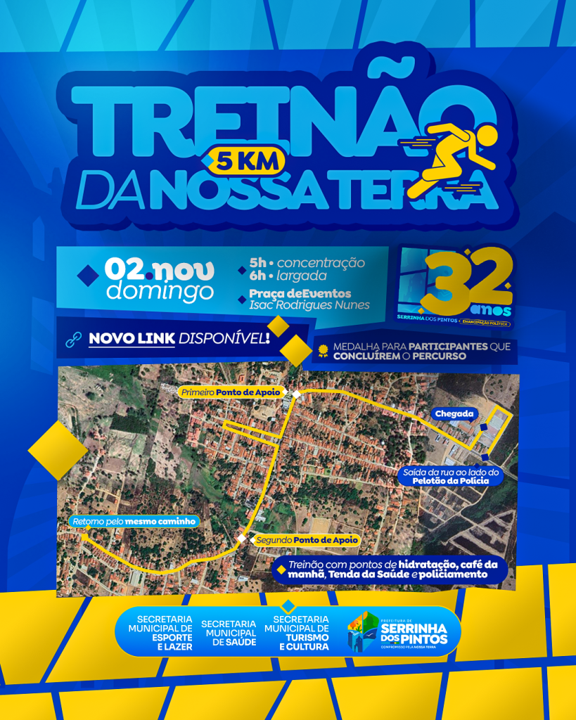 Prepare o tênis, programe o despertador e vem com a gente finalizar as atividades em celebração aos 32 anos de Serrinha dos Pintos com muita energia, saúde e espírito esportivo!