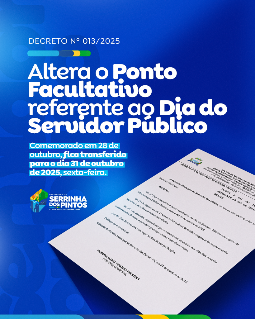 A Prefeitura Municipal de Serrinha dos Pintos comunica que o ponto facultativo referente ao Dia do Servidor Público, comemorado em 28 de outubro, será transferido para o dia 31 de outubro de 2025 (sexta-feira).