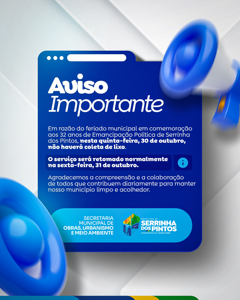 Em razão do feriado municipal em comemoração aos 32 anos de Emancipação Política de Serrinha dos Pintos, nesta quinta-feira, 30 de outubro, não haverá coleta de lixo.