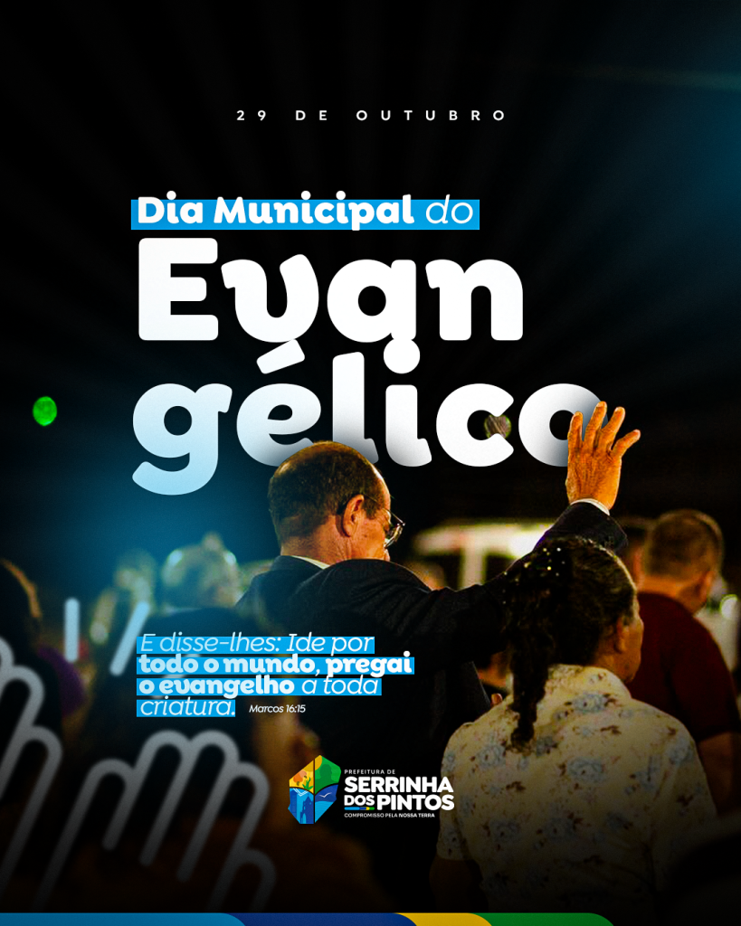 Hoje, 29 de outubro, é o Dia Municipal do Evangélico, uma data de fé, comunhão e gratidão a Deus por todos aqueles que dedicam suas vidas a anunciar o Evangelho e a espalhar a mensagem de amor, esperança e salvação em nosso município.
