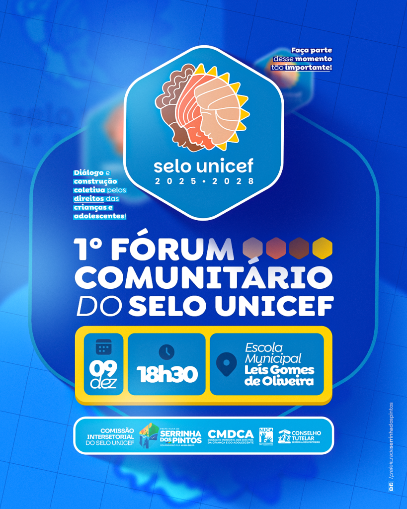 No dia 09 de dezembro, às 18h30, acontecerá o 1º Fórum Comunitário do Selo UNICEF 2025–2028, um momento fundamental para dialogar, construir propostas coletivas e planejar ações que contribuem diretamente com a proteção e a garantia de direitos da infância e adolescência.