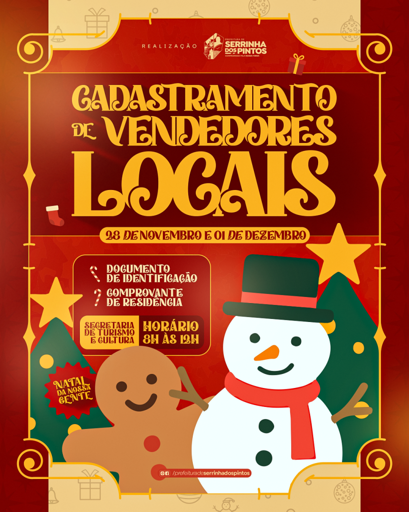 A Prefeitura de Serrinha dos Pintos, por meio da Secretaria de Turismo e Cultura, informa que o cadastramento de vendedores locais para atuar no “Natal da Nossa Gente”, que será realizado nos dias 06, 13 e 20 de dezembro, acontecerá nesta sexta-feira, 28 de novembro, e na segunda-feira, 01 de dezembro.