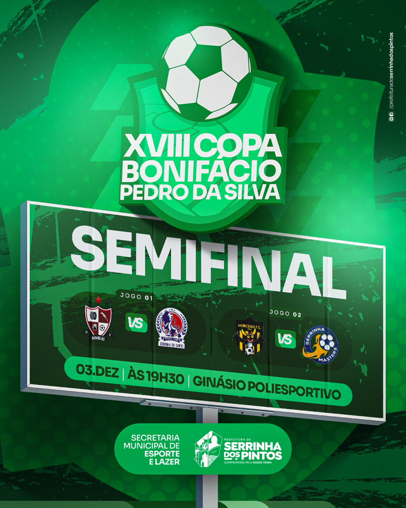 A bola vai rolar rumo à grande decisão! Nesta quarta-feira, 03 de dezembro, acontecerá a semifinal da XVIII Copa Bonifácio Pedro da Silva, trazendo dois duelos decisivos no Ginásio Poliesportivo Genilson Ferreira de Lemos, a partir das 19h30.