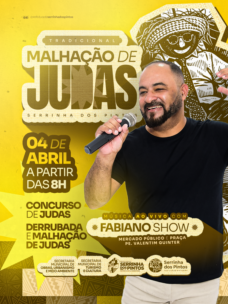A programação conta com Concurso de Judas, com premiação para os cinco primeiros colocados, além da Derrubada e Malhação de Judas e música ao vivo com Fabiano Show, garantindo animação do começo ao fim!