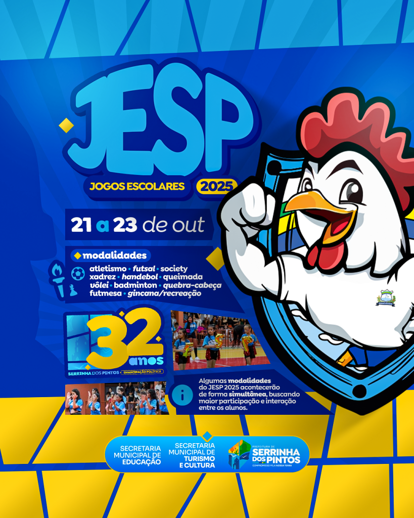 De 21 a 23 de outubro, os estudantes serrinhenses estarão juntos em mais uma edição do JESP 2025 – Jogos Escolares de Serrinha dos Pintos, um evento que celebra o talento, o trabalho em equipe e o espírito esportivo.