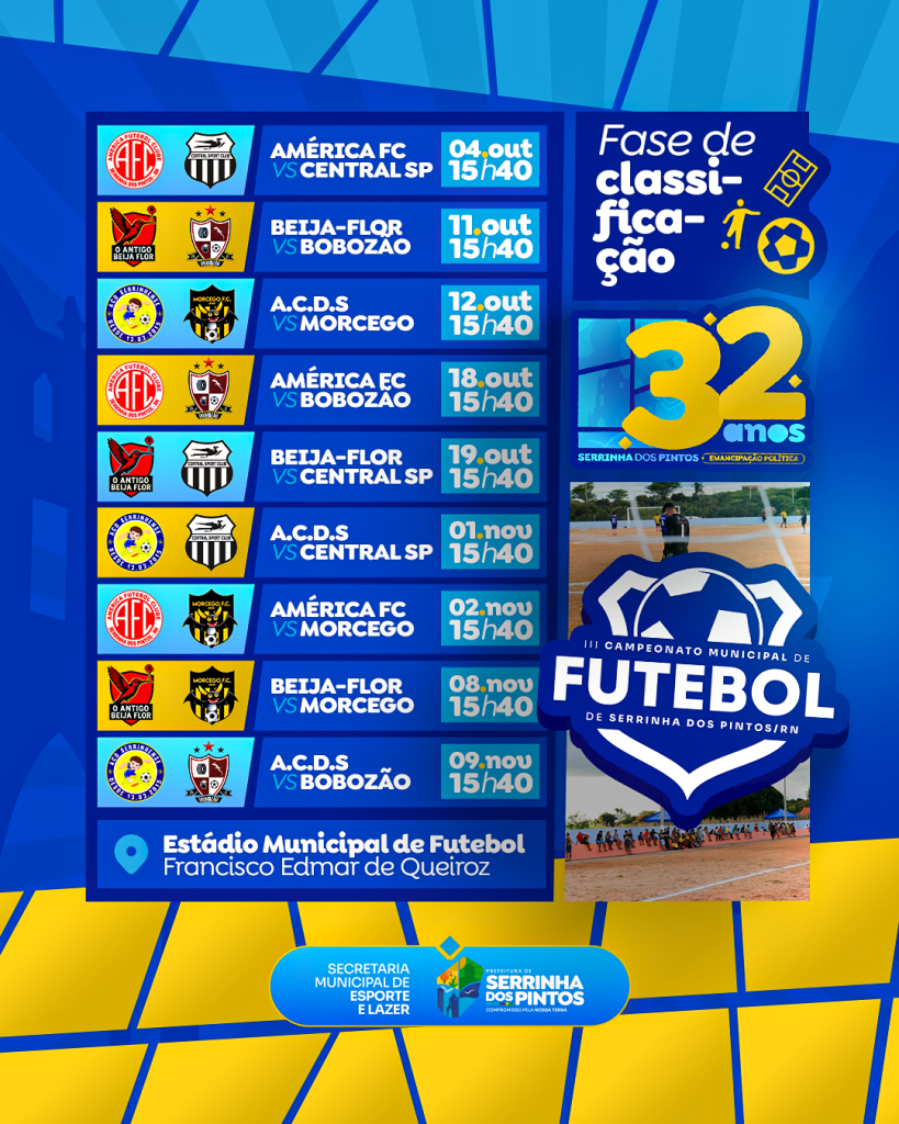 Neste sábado, 04 de outubro, a partir das 15h40, o Estádio Municipal Edmarzão será palco da abertura do III Campeonato Municipal de Futebol de Serrinha dos Pintos, com o confronto entre América FC x Central SP.