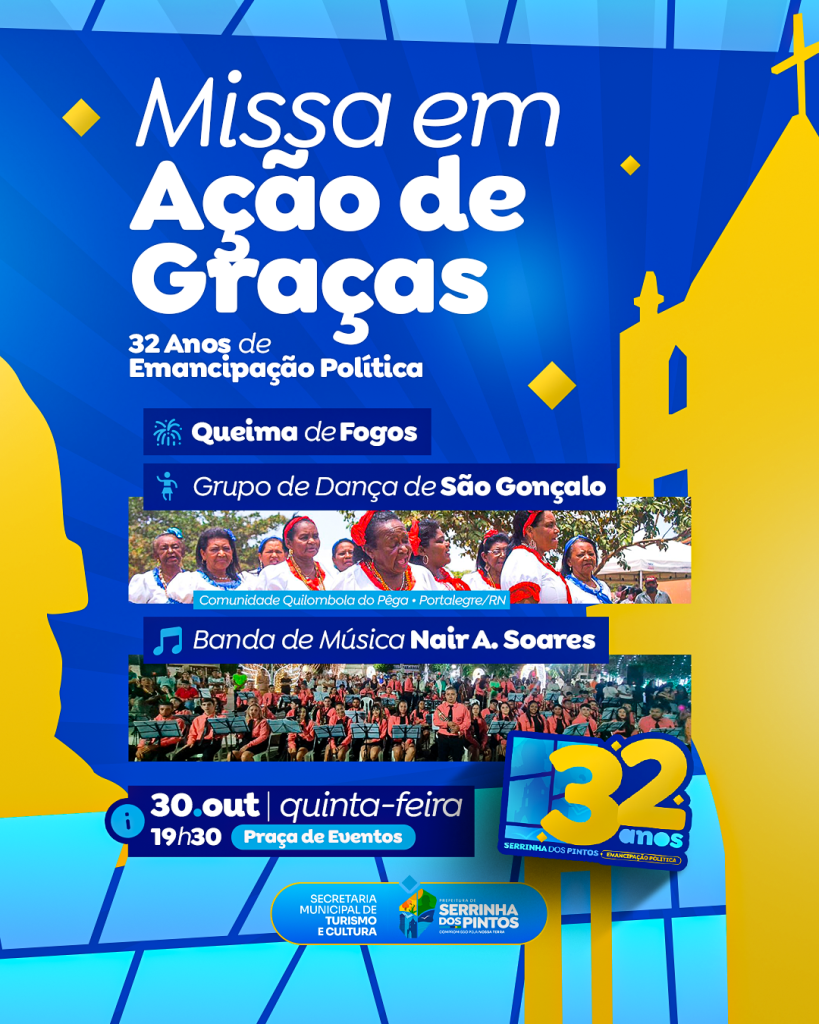 Missa em Ação de Graças pelos 32 anos de Emancipação Política de Serrinha dos Pintos! Um momento de fé, gratidão e união para celebrar a história e o progresso da nossa terra.