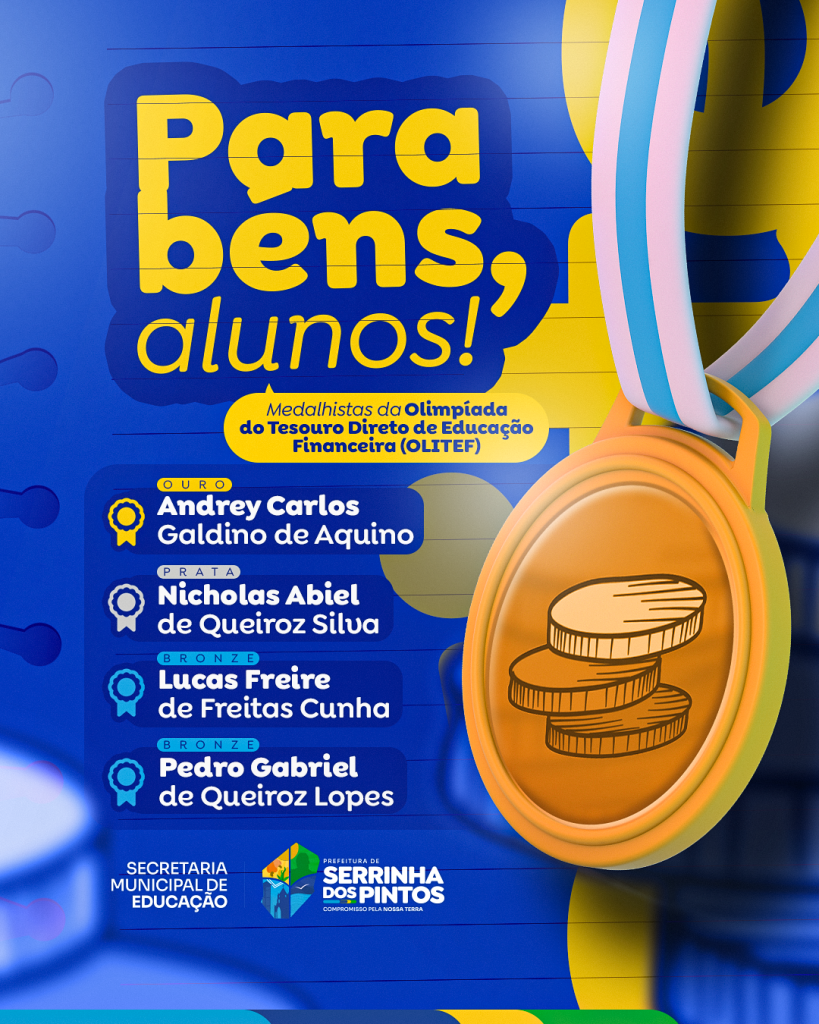 Parabéns aos nossos estudantes que conquistaram medalhas na Olimpíada do Tesouro Direto de Educação Financeira (OLITEF). O resultado é fruto de dedicação, esforço e comprometimento com o aprendizado, representando com orgulho nossa Rede Municipal de Ensino.